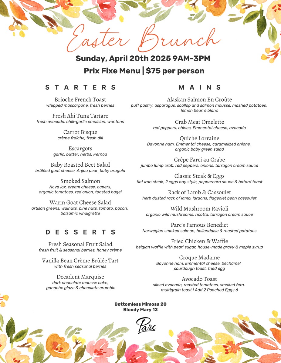2025-12-25 09:00:002025-12-25 21:00:00America/Los_AngelesHoliday Brunch and DinnerChristmas Day Brunch 9:00 am - 3 pm Followed by Christmas Day Dinner 5 pm - 8 pm Please call for Reservations at 619.795.1501Parc- Bistro and BrasserieParc- Bistro and Brasseriehumberto@parcbb.com